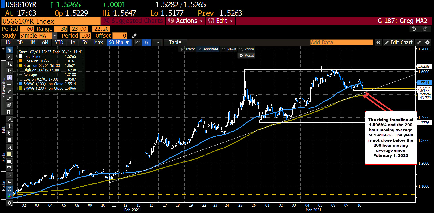 Technically, although below its 100 hour moving average, the yield remains above a trendline on the hourly chart at 1.5069%, and the rising 200 hour moving average at 1.4966%. Back on March 2, the yield tested that 200 hour moving average for the first time since February 11, and found support. The yield has not closed below its 200 hour moving average since February 1, 2021.