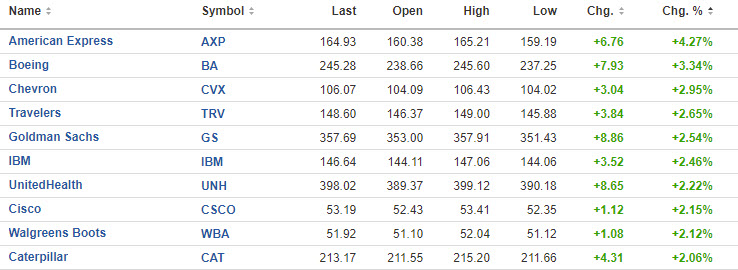 Leading the way in the Dow is American Express which rose 4.25%. The tops 10 gainer include: