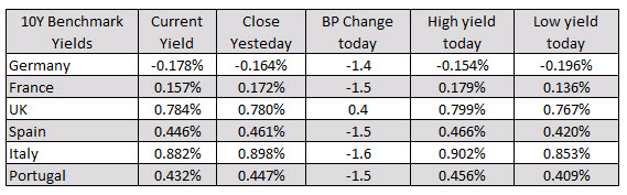 In the European debt market, the benchmark 10 year yields are mostly lower with the exception being the UK 10 year up 0.4 basis points. The yields are off their lowest levels of the day however.
