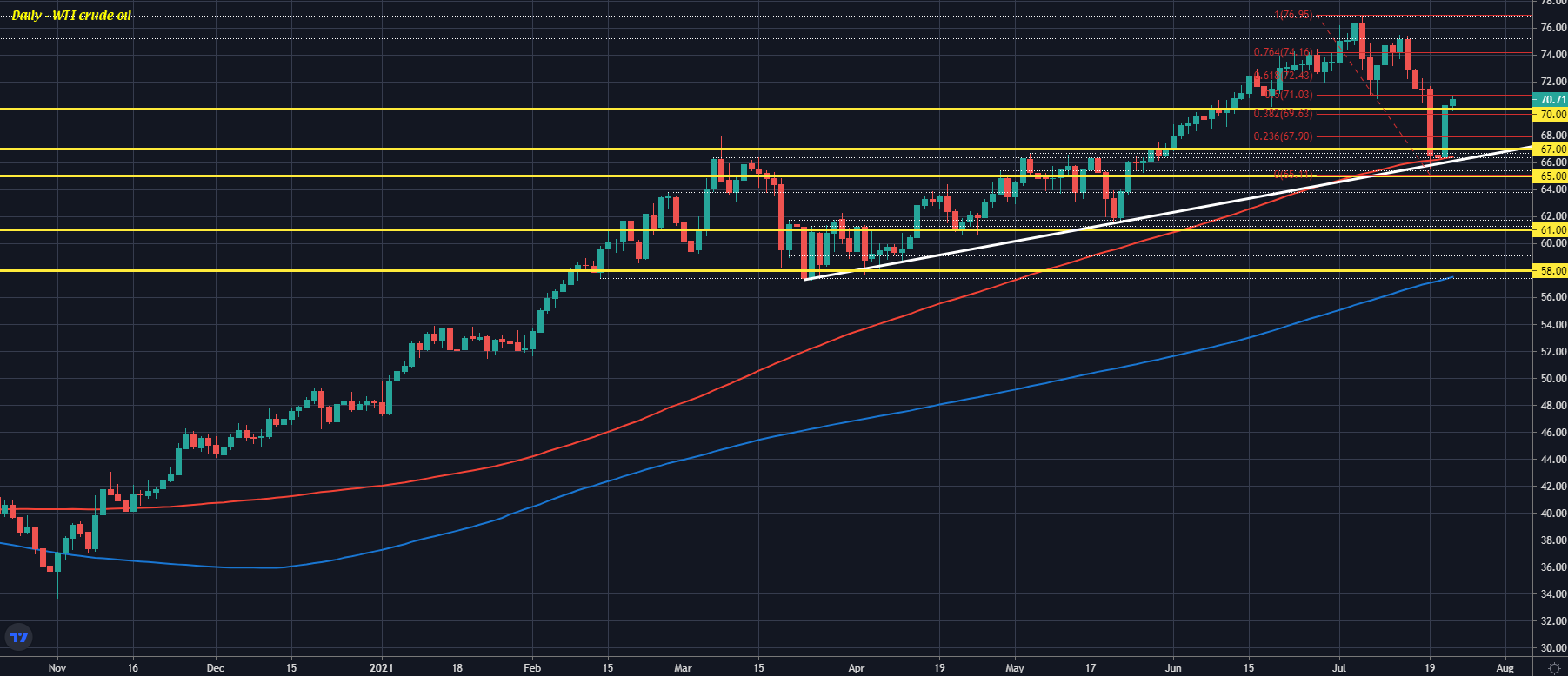 The drop at the start of the week was a big one and took oil towards testing key technical levels in the form of the trendline support from March to May and also the 100-day moving average (red line). Both levels held.