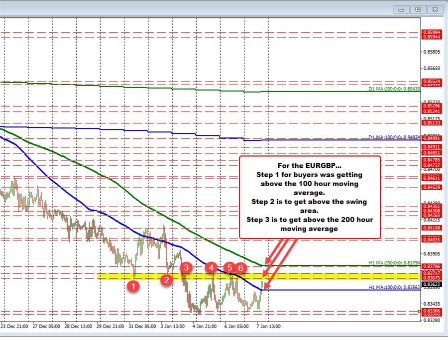 So, getting above the 100 hour moving averages step 1. Getting above the swing area would be a step 2. The falling 200 hour moving average currently at 0.83794 would be step 3 in increasing the bullish bias for this trading pair. PS. The last time the price traded above its 200 hour moving average was back on December 21.