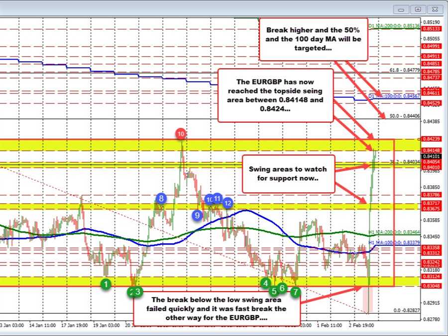 The highs today have now entered into a topside swing area between 0.84148 and 0.8424 (see red numbered circles). Along the way, the pair cracked above the 100/200 hour MAs and swing areas around 0.8370 and 0.8403.