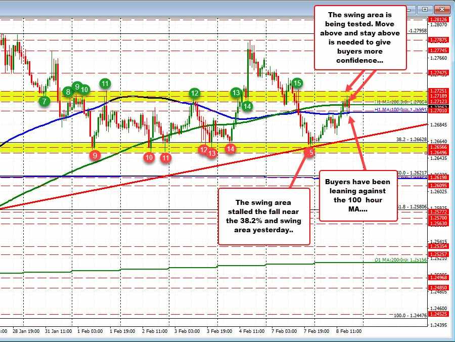 The high price reached 1.27189 which stalled within a swing area between 1.2712 and 1.2725 (see green numbered circles). So far, the 100 hour moving average has been able to hold support in the short term on the modest move back down. However, a move below that level with more momentum could see the buyers turn to sellers on disappointment against topside resistance.