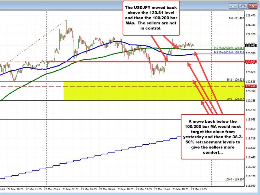 So looking at the five minute chart below, the price did move back above the 120.81 level, and stayed above that level. The price also moved above the 100 and 200 bar moving averages, and stayed above those moving averages (so far).
