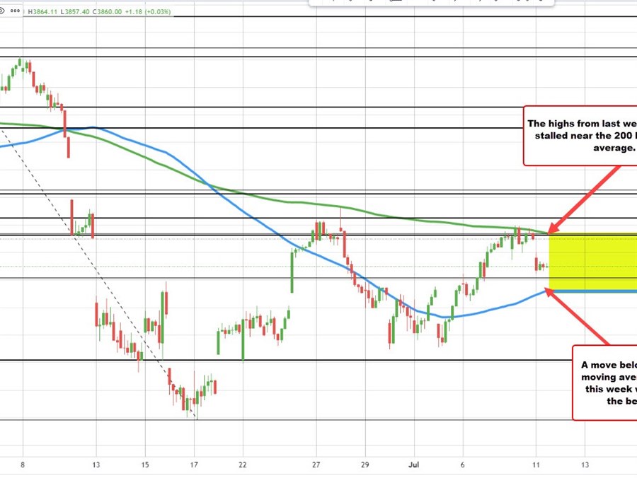 The S&P index gapped a lower from Friday’s closing levels at the open and then have consolidate the declines during the morning session. The high prices from Friday stalled near the falling 200 hour moving average currently at 3907.83. On the downside, the 100 hour moving average is rising and currently trades at 3823.80.