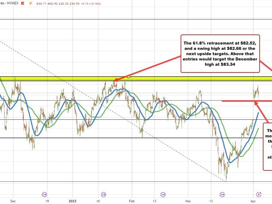 The price of oil gapped higher yesterday after the OPEC+ surprise cut in production over the weekend. That move sent the price back above the $80 level. On a bigger move higher, the 200 day MA at $84.46 would be eyed. The price has not traded above the 200 day MA since the end of August 2022. The 38.2% of the move down from the 2022 high is up at $89.63. Some analysts see the price of oil settling between $70 on the downside and $90 on the upside.