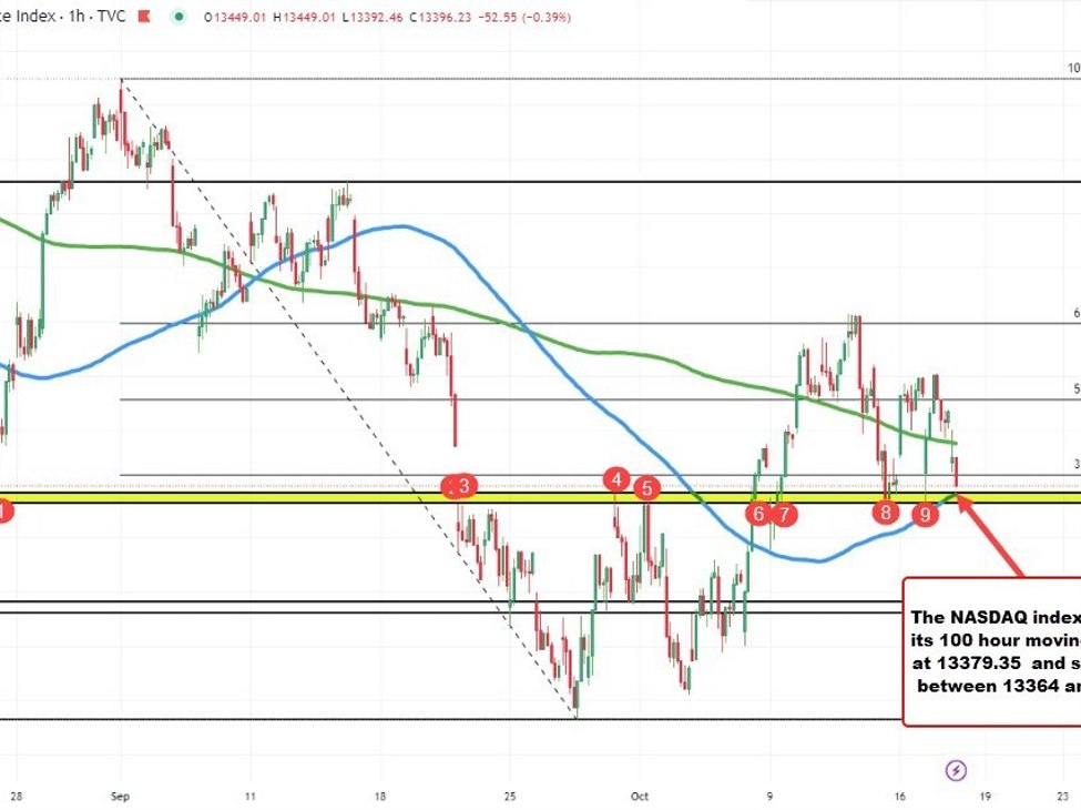 This area will be a key barometer for traders in the short-term. Hold support (dip buyers enter here) and a rotation back toward the 200-hour moving average (green line on the chart above) currently at 13473.82 would be eyed on a bounce.
