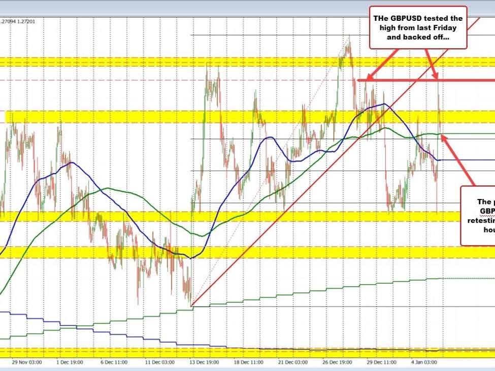 - The GBPUSD which raced above the 200-hour MA at 1.27075, and up to a high of 1.2770 is back down retesting the 200-hour MA.